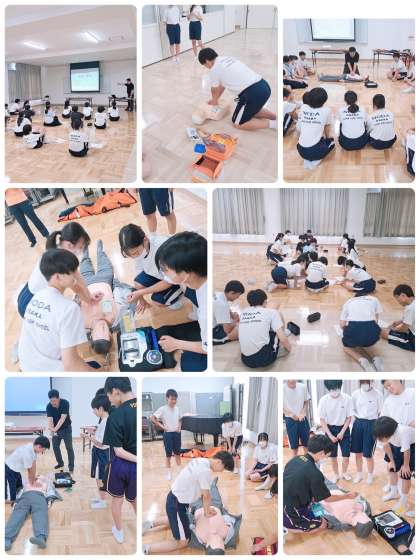 7月12日(水)、普通救命講習会が多目的室で行いました。全学年保健委員と生徒会を対象に今年度も普通救急救命講習を行う資格を持っている東教頭先生が講師を務めてくださいました。