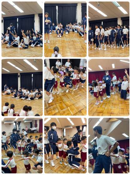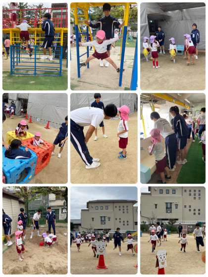 生徒たちは、汗だくになって、園庭で幼児と一緒に運動遊びや遊具を使っての遊び、砂場での砂遊びをしたいました。