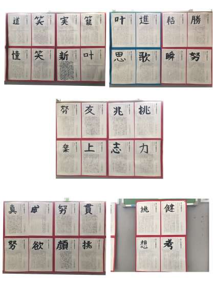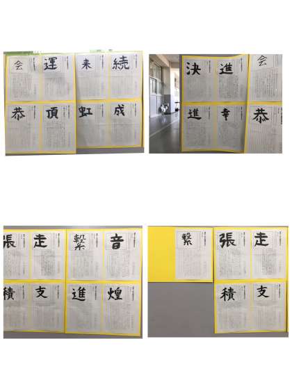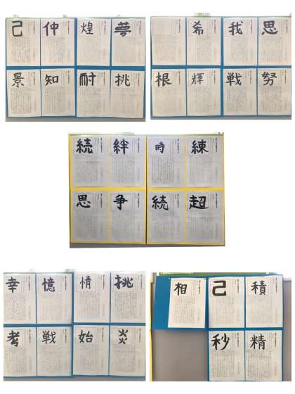 漢字ひと文字を選び、その漢字に因んで自分の想いを表現しています。「中学校生活のこと」、また「これまで一生懸命に取り組んできたこと」、さらに「これからのこと」、「その意気込み」など、自分自身を見つめて、それぞれの想いがいっぱいこもった作品になっています!