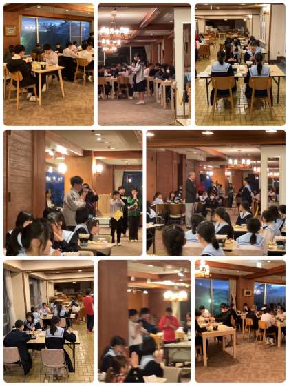 夕食の準備が整って、入館式が行われました。支配人さんのお話の後、代表生徒が気持ちの良い挨拶をしました。