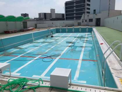 本日、業者さんがプール清掃をしてくれています。また事前に、管理作業員の中田さんが、プール周りやプールから一階への非常階段を掃除してくれました。