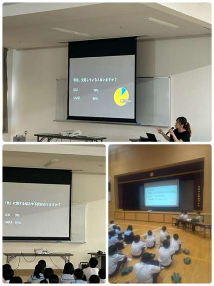 本日5限目は、2年生は西館4Fホールで、1年生は体育館で性教育の学習に取り組んでいます(3年生は6限に体育館で性教育の学習に取り組みます)2年生は、本校教員の齋藤先生がスライドを用いて、1年生はゲストティーチャーとして助産師の方をお招きしてお話をしていただいています。