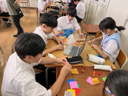 班活動で教え合いながら、友達と協力して折り鶴を折っていました。
