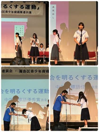 福島区民センターで、社会を明るくする運動の福島地区集会がありました。あわせて福島区内の中学校3校から募られた標語の表彰式も行われました。本校から5作品が選ばれ、2人の生徒が表彰式に出席し表彰を受けました。