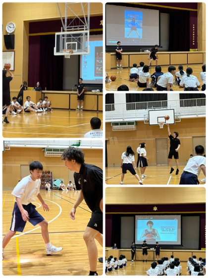 本日、福島区の派遣事業が本校で行われました。講師は大阪エヴェッサの木下誠選手と小嶋将志朗トップマネージャーで、1年生にバスケットボールの実技指導をしていただきました。プロの技術を目の当たりにし、大いに盛り上がりました。木下選手、小嶋マネージャー、またスタッフの方々、貴重な体験をさせていただき、ありがとうございました。