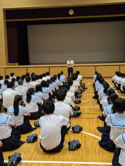校長先生からは、役割りについてのお話しがありました。表彰伝達では、キックベースボール3位の表彰がありました。また生徒会役員よりまだまだ続く暑さ対策について話がありました。