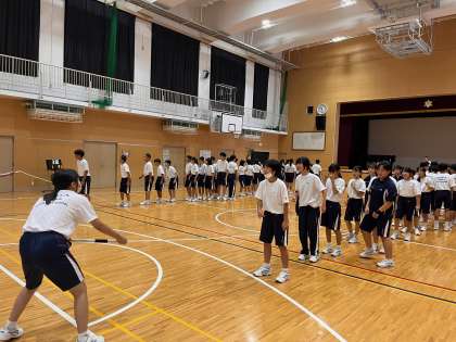本日の体育では学年種目である全員大縄跳びの練習をしていました。