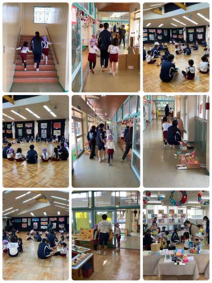 続いて、遊戯室で手遊びをした後、保育室や遊戯室に飾られている作品を鑑賞するため、園児の皆さんに案内してもらいました。