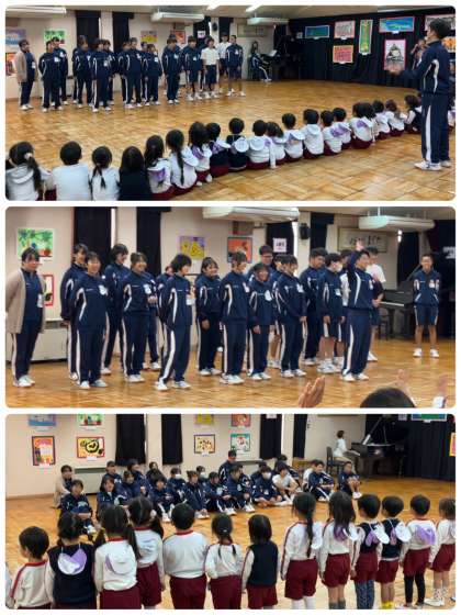 最後に、お世話になったお礼に、中学生から歌をプレゼントしました。そのお返しに、園児から歌を歌っていただきました。