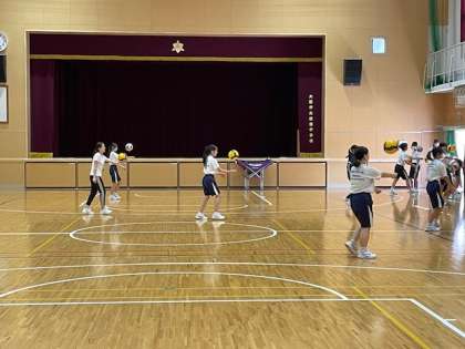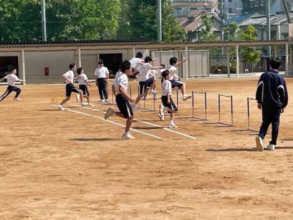 2年生の体育では、男子ハードル、女子はバレーボールの基礎練習を行っています。