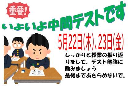 中間テスト、1週間前となりました。1年生にとっては初めてのテストです。