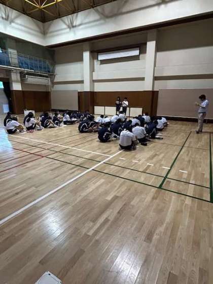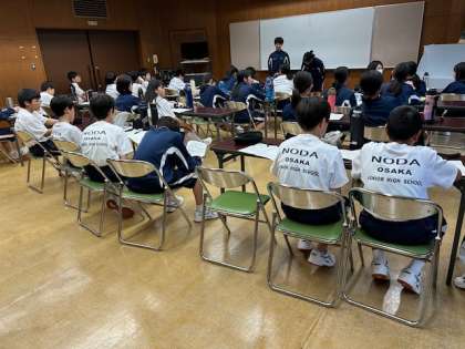 学校出発から、これまでの活動のふりかえり、しおり記入、キャンプファイアーのスタンツ練習をおこなっています。