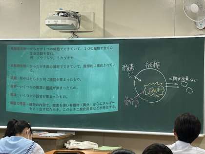 本日2限、教育実習生による理科の研究授業が行われました。単細胞生物と多細胞生物のはたらきについて班による調べ学習に取り組みました。