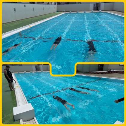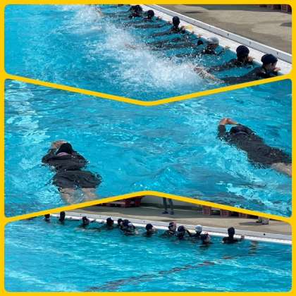 1年生の体育では、いよいよ水泳の授業が始まりました。バタ足や蹴伸びの練習から始めています。
