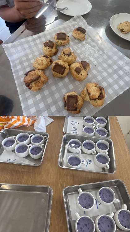 幼児保育を学ぶ観点から、3歳から食べられるお菓子ということでホットケーキミックスで作るチョコスコーンとブルーベリーミルクゼリーを作りました。