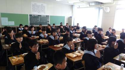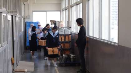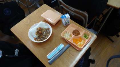 先週に定めた給食係が早速に配膳の準備を行い、食事中は