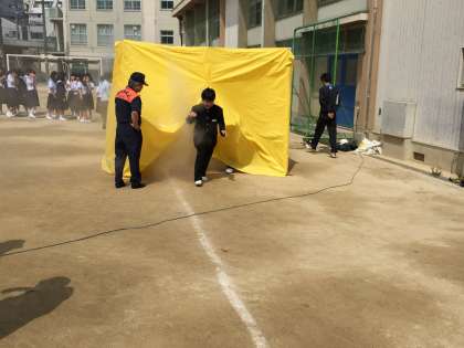 訓練プログラムは、消火器の使用実践、煙被害の実体験、搬
