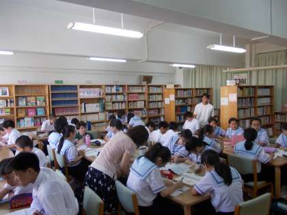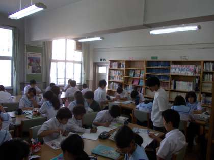 生も加わり図書室が満席状態で、それぞれのグループで教え