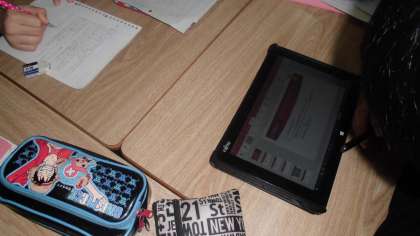 グループでアイデアを出し合い話し合った内容をタブレットを