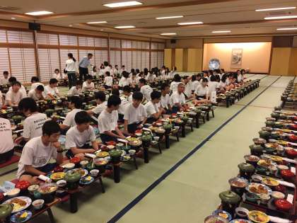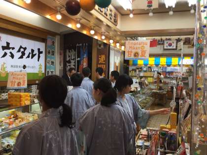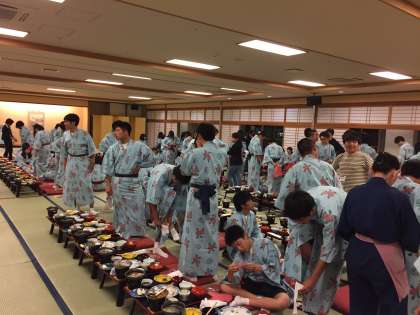 大広間で全員そろっての夕食。食べ終わったら浴衣に着替えて、ショッピング。おみやげを購入したり、飲食を楽しみました。