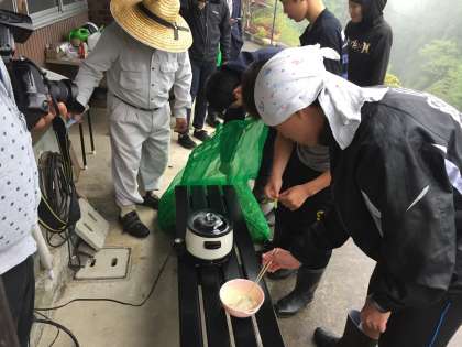 2日目の午後は各家庭に分かれての農林業体験です。そこに住まれているみなさんの暮らしをそのまま体験させてもらいました。あいにくの雨天で、野外での活動は難しかったかもしれませんが、みんなで楽しそうにチャレンジしました。