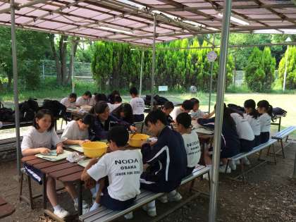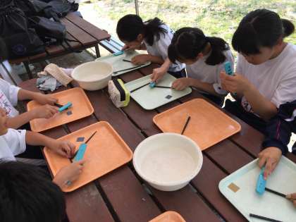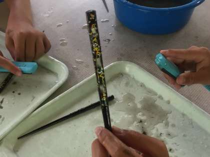 マイ箸づくりに取り組みました。箸磨きに没頭しています。完成したお箸は、どれも異なる模様になります。