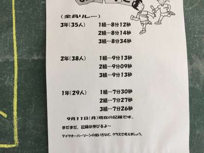 全員リレーのタイムが9月11日時点の速報として、校内の掲