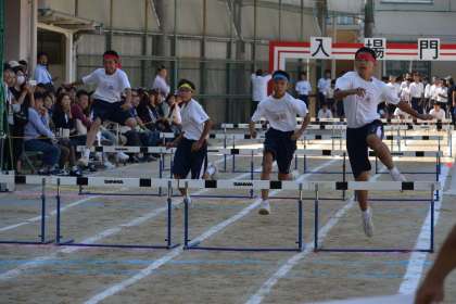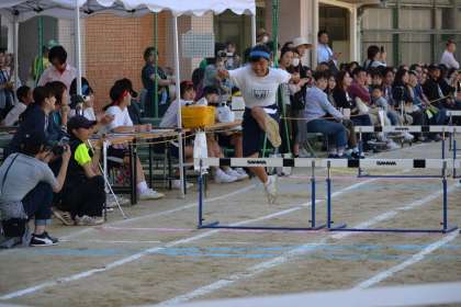 ハードル走では、3年生女子陸上部員が流石に見事なフォームを