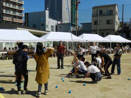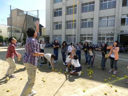 PTAの皆様による玉入れです。籠の位置が高くなかなか
