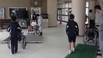 1年生は、車イス搬送、高齢者疑似体験、アイマスク体験で