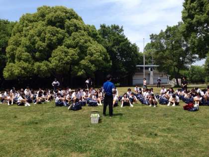 まずはじめに学級写真を撮り、その後、センターの方から野外炊事の説明をしていただきました。