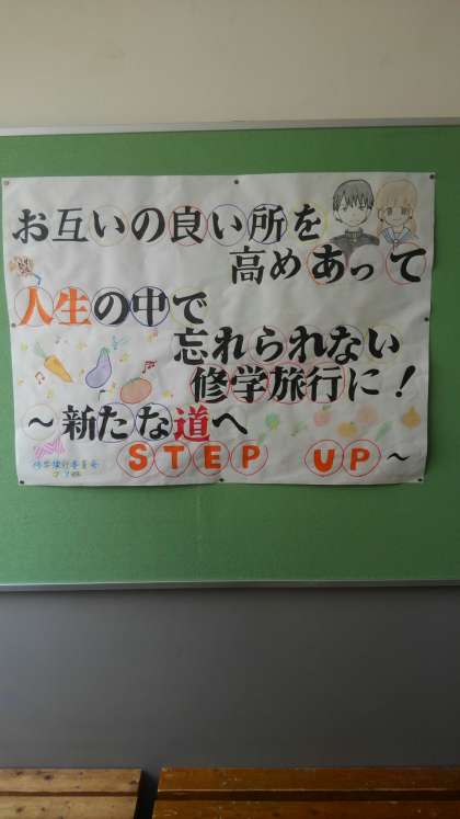 今、教室では、月曜日からの中間テストに備えて勉強に集中する姿が見られます。テストが終われば、また取り組みが再開されます。スローガンが達成でき、修学旅行が大成功することを願います。