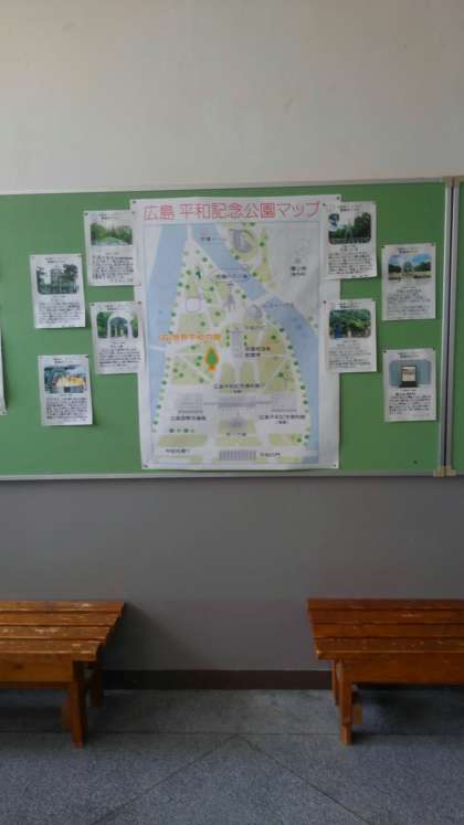 学年ホールには、修学旅行マップとともに、スローガンや平和学習の取り組み成果が掲出されています。いずれも係り・担当生徒の作品です。