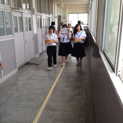 1年生は全員給食となっているので、当番の生徒が配膳室から写真のように各容器や主食・副食ごとに受け取り、教室で他の生徒に渡します。