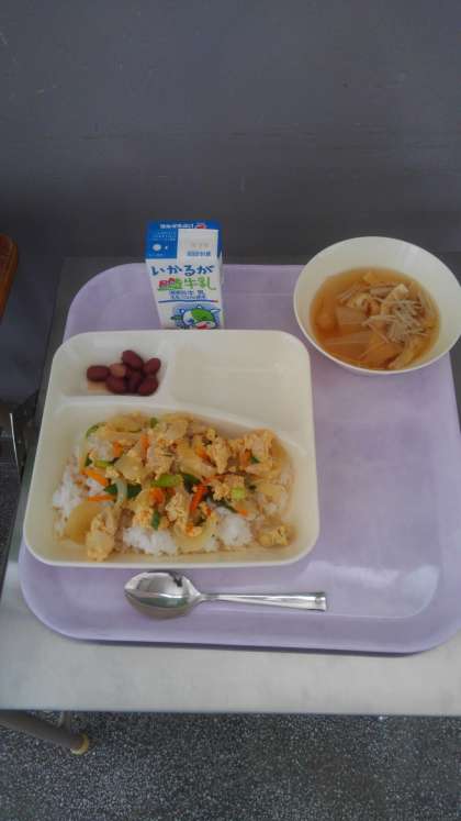 今日の献立は、親子丼、とうがんのすまし汁、金時豆の煮もの、牛乳です。