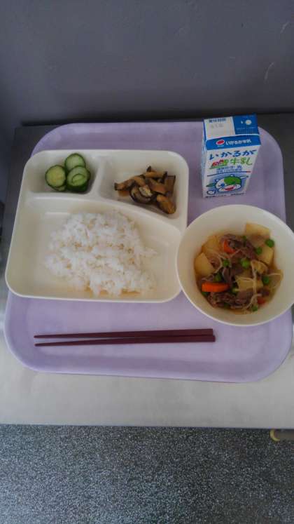 今日の献立は、肉じゃが、焼きなすのみそだれかけ、あっさりきゅうり、ごはん、牛乳です。