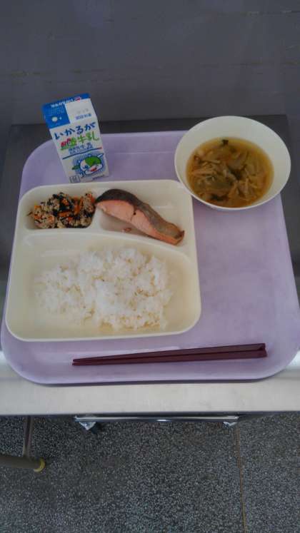 今日の献立は、さけのしょうゆ風味焼き、五目汁、高野どうふのいり煮、ごはん、牛乳です。