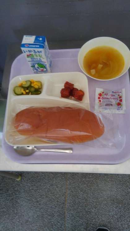 今日の献立は、まぐろのオーロラ煮、スープ、きゅうりとコーンのゆずドレッシング、パン、牛乳です。