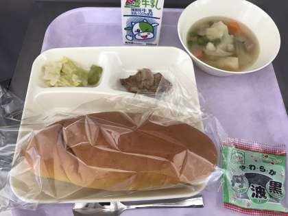 今日の献立は、鶏肉の香草焼き、スープ煮、サワーキャベツ、ソフト黒豆、パンプキンパン、牛乳です。