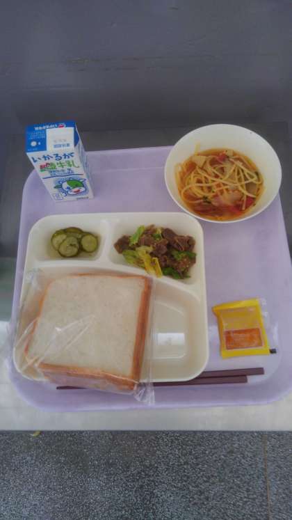 今日の献立は、牛肉のカレー風味焼き、トマトのスープスパゲッティ、きゅうりのサラダ、パン、あんずジャム、牛乳です。