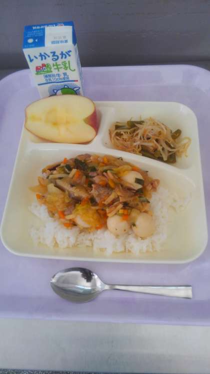 今日の献立は、中華丼、もやしの中華あえ、りんご、牛乳です。