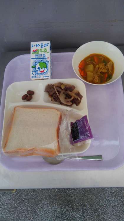 今日の献立は、牛肉の香味焼き、豚肉とだいこんのカレー煮、うずら豆のグラッセ、パン、ブルーベリージャム、牛乳です。