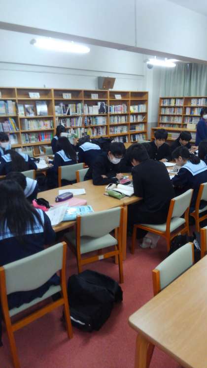 図書室では、先週の火曜日から元気アップの自主学習会を開いています。この日は、30人ほどの生徒が参加して、テスト勉強をしていました。テスト前日の明日(11月27日)も開設しています。