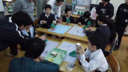 校区小学校から5名の児童の参加があり、合わせて8名でたこ焼きやクリスマスの工作をしたり、体育館でソフトバレーボールをしたりして交流を深めることができました。