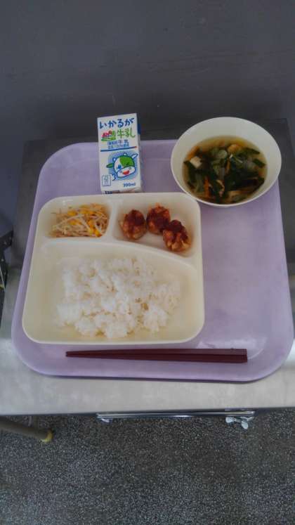 今日の献立は、あげシューマイ、えびととうふのスープ、もやしとコーンのピリ辛あえ、ご飯、牛乳です。