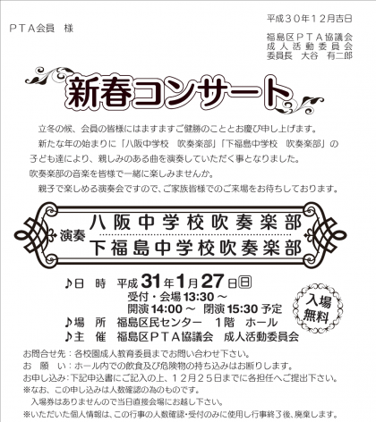 本日、福島区PTA協議会『新春コンサート』ののご案内を各家庭に配布いたしました。