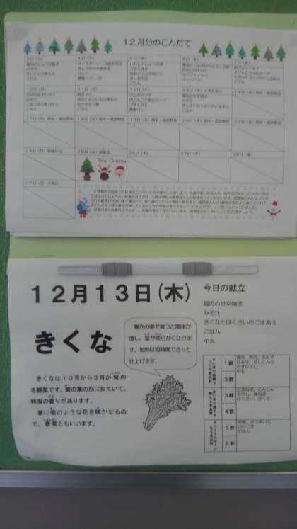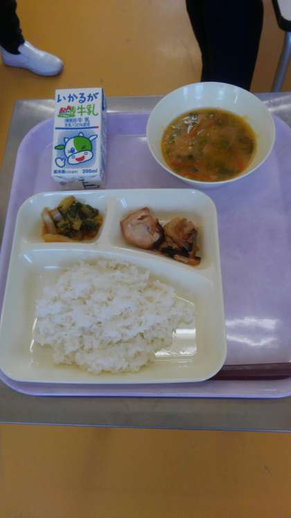 今日の献立は、鶏肉の甘辛焼き、みそ汁、きくなとはくさいのごまあえ、ごはん、牛乳です。
