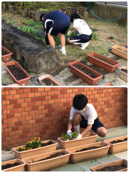 放課後は、生徒会役員のみんなが正門に並ぶ花壇の苗の植え替えを行いました。