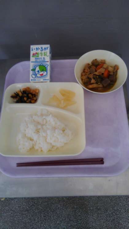 今日の献立は、筑前煮、ひじき豆、だいこんのゆず風味、ごはん、牛乳です。