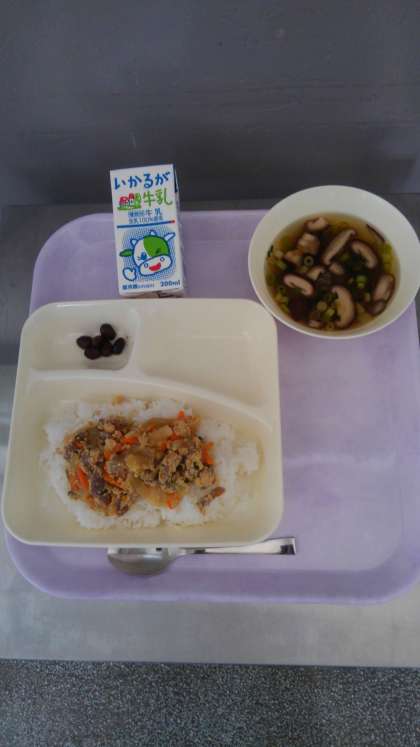 今日の献立は、他人丼、すまし汁、黒豆の煮もの、牛乳です。